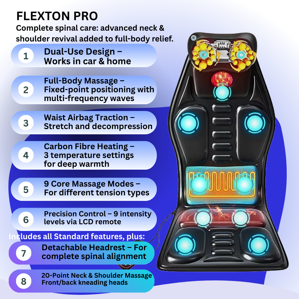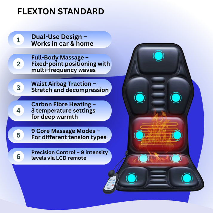 - It’s not just cheaper—it’s smarter. A £800 chair is stuck in one room. FlexTon delivers the same deep, therapeutic relief for your back, neck, and hips but follows you everywhere. You’re not buying a piece of furniture; you’re buying a pain-free lifestyle.