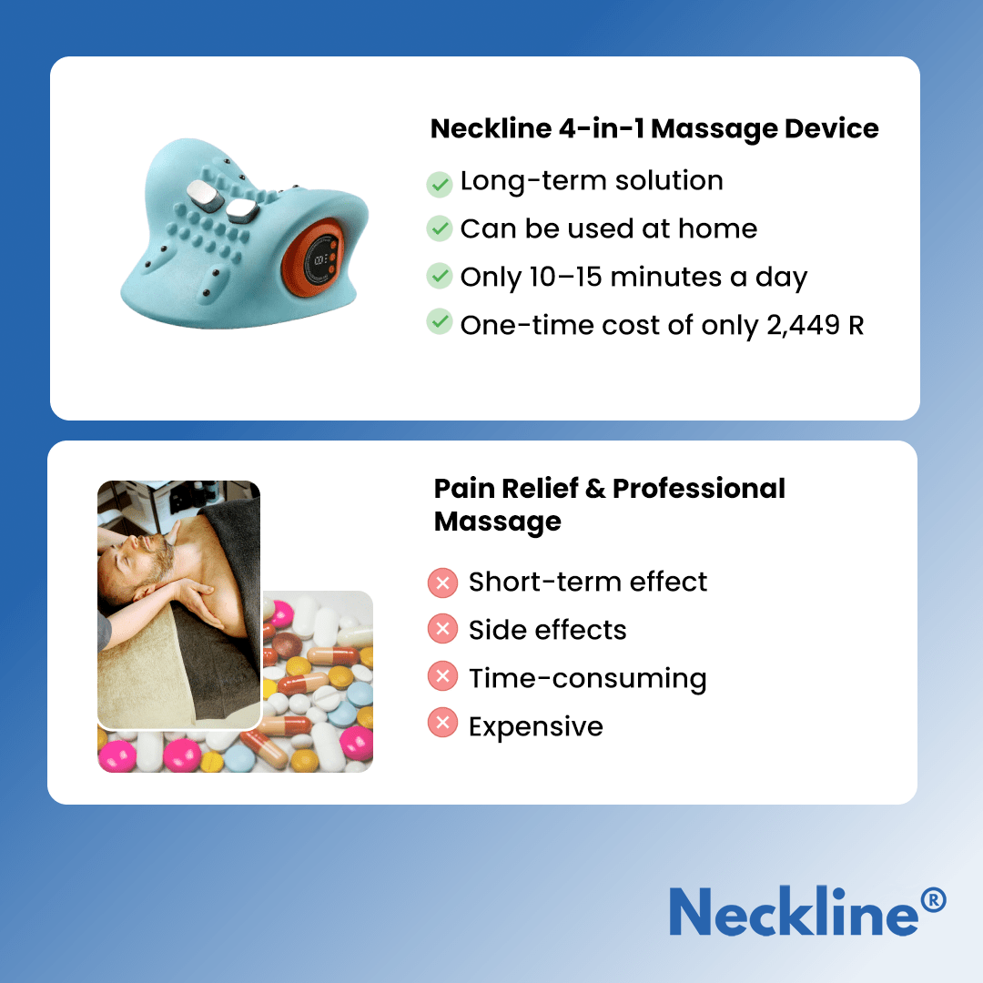 Neckline® helps with neck pain by combining stretching, massage, EMS and heat. A special 26° cervical traction relaxes the muscles, while EMS improves blood circulation. The massage cushions release tension, and heat dilates the blood vessels, which promotes healing. Just 10–15 minutes a day is enough to achieve noticeable relief – often from the first day.
