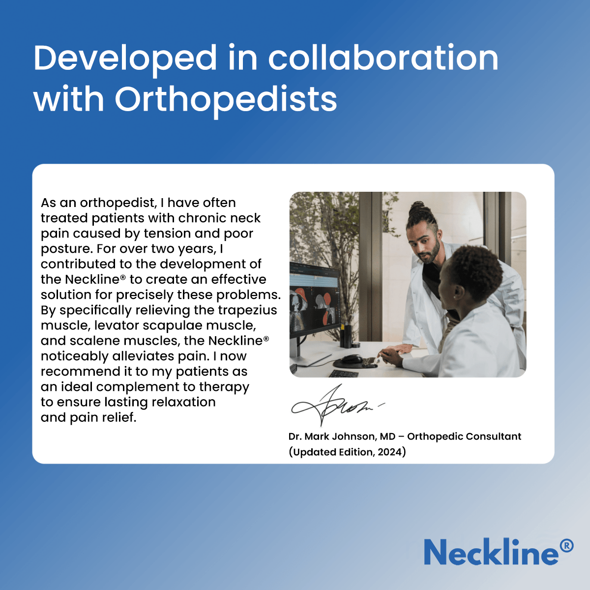 As an orthopedist, I have often treated patients with chronic neck pain caused by tension and incorrect posture. For more than two years, I have contributed to the development of Neckline® to create an effective solution for these very problems. By specifically relieving the trapezius muscle, the levator scapulae muscle and the scalene muscle, Neckline® significantly relieves pain. I now recommend it to my patients as an ideal complement to therapy to ensure long-term relaxation and pain relief.